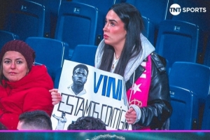 据TNT报道,一位球迷在伯纳乌球场举起支持维尼修斯的标语牌,上面写着“维尼修斯,我们与你同在”,表达对这位皇马前锋的支持,此前的比赛中,维尼修斯曾遭到皇马球迷的嘘声对待。