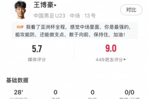 体育资讯1月25日讯 U23亚洲杯决赛,U23国足0-4不敌日本U23,夺得赛事亚军。替补出战的王博豪数据如下:
