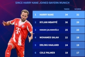 凯恩加盟拜仁后34罚打进32粒点球是同期最多,姆巴佩36罚29中第二