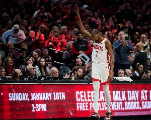 开拓者播音员致敬杜兰特,和杜兰特握手,杜兰特随后和斯普利特拥抱,开拓者现场观众鼓掌致敬,KD单手指天回以致意