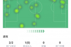 触球43次、传球29次、关键传球1次、传球成功率79.3%、传中1次、长传1次成功率100%